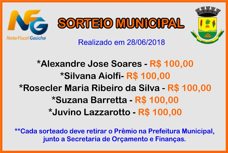 No dia 28 de junho foi realizado mais um sorteio municipal do Programa Nota Fiscal Gaúcha, onde participaram 6.650 bilhetes, tendo sido sorteados: Alexandre Jose Soares, Silvana Aiolfi, Rosecler Maria …