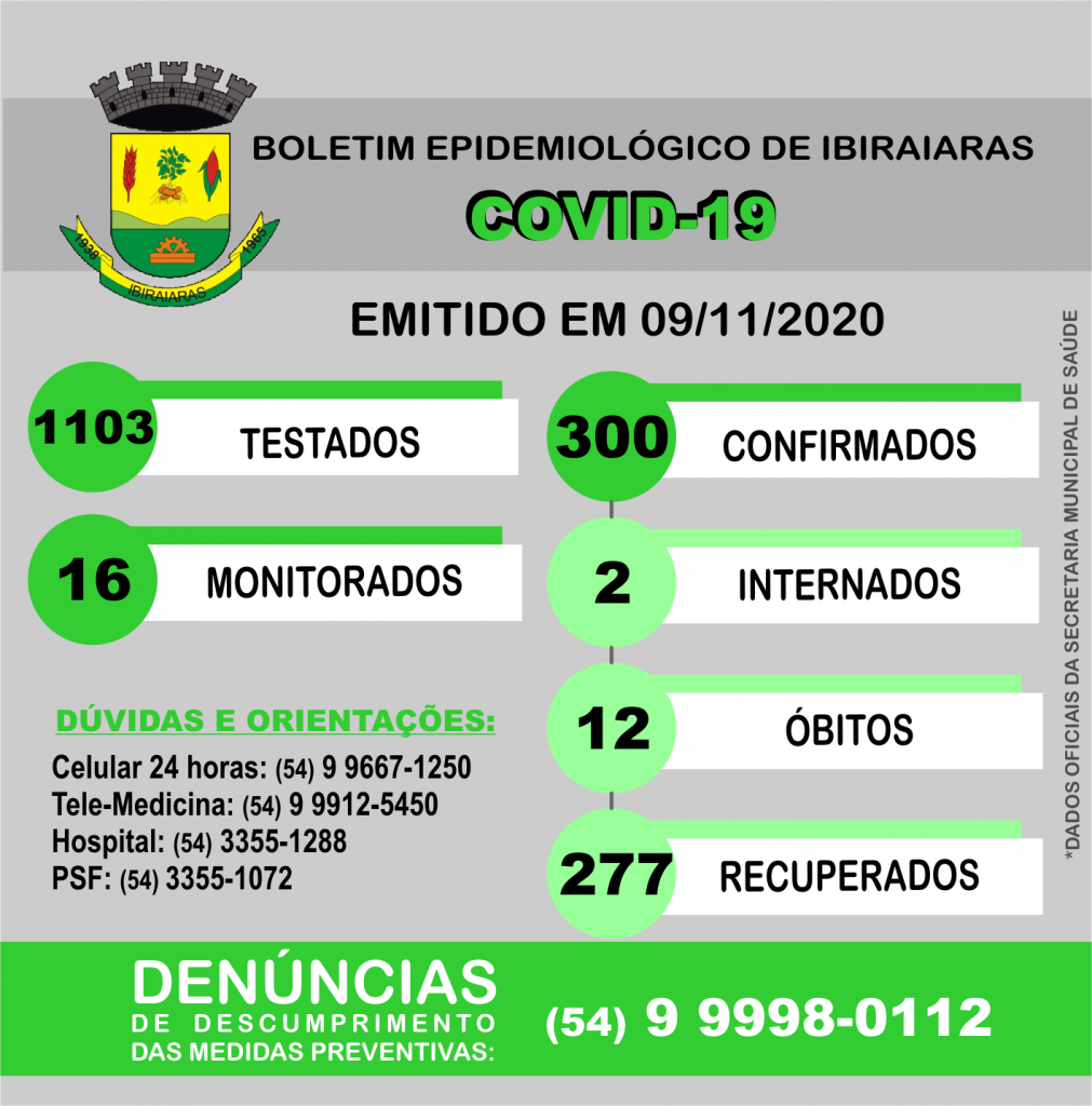 BOLETIM EPIDEMIOLÓGICO Publicado em 9 de novembro de 20209 de novembro de 2020 por Assessoria de Imprensa e Comunicação Prefeitura de Ibiraiaras 09 de novembro