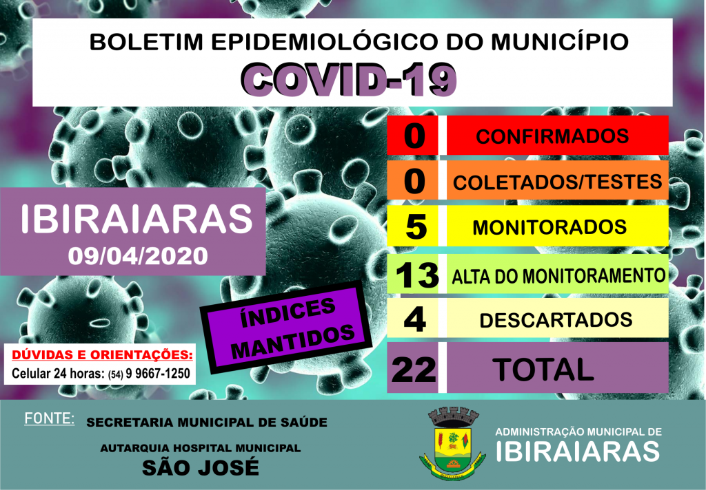 BOLETIM EPIDEMIOLÓGICO DESTA QUINTA-FEIRA (09) MANTÉM ÍNDICES Publicado em 9 de abril de 20209 de abril de 2020 por Assessoria de Imprensa e Comunicação Prefeitura de Ibiraiaras