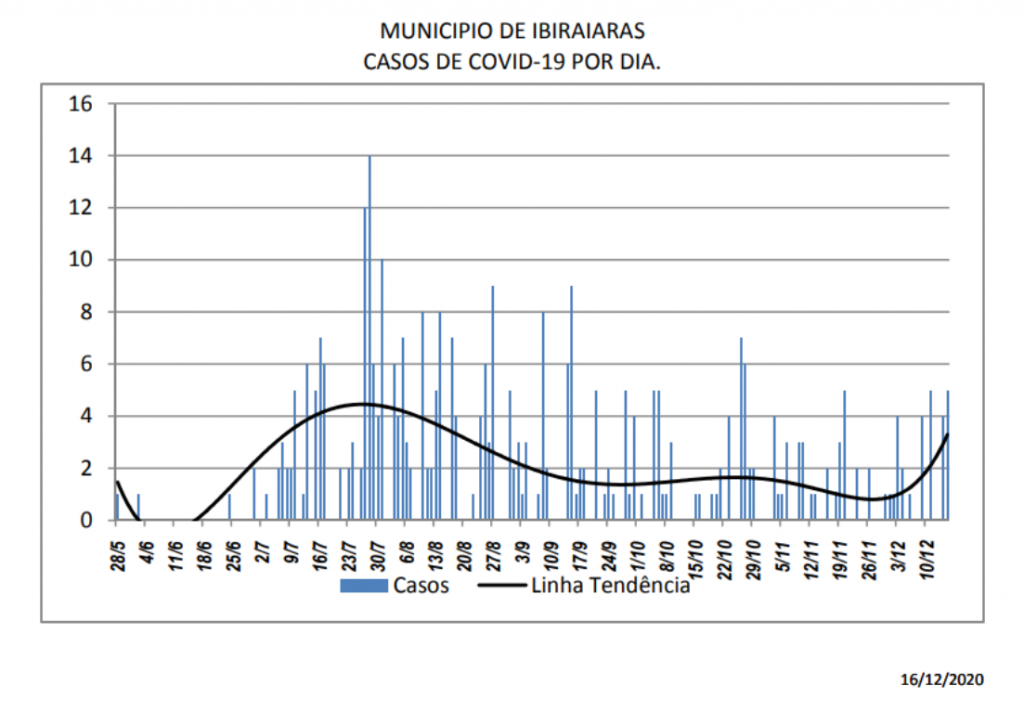 BOLETIM EPIDEMIOLÓGICO E EVOLUÇÃO DOS CASOS EM IBIRAIARAS Publicado em 16 de dezembro de 202016 de dezembro de 2020 por Assessoria de Imprensa e Comunicação Prefeitura de Ibiraiaras 16 de dezembro Acompanhando o boletim, divulgamos os gráficos de evolução de casos no Município, onde aparece a evolução de forma diária e também cumulativa, desde o início dos casos em Ibiraiaras.