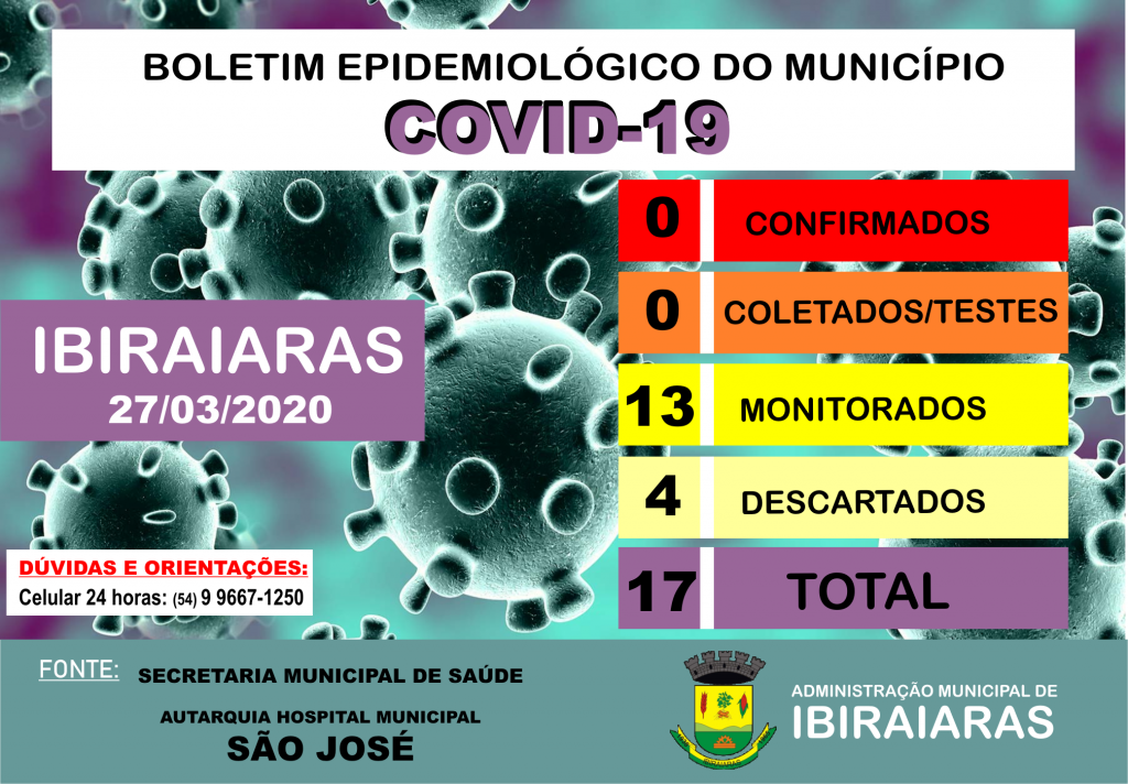 No boletim desta sexta-feira, dia 27 de março, divulgado pela Secretaria Municipal de Saúde e Hospital São José, o número de casos monitorados no Município aumentou de 11 de dia de ontem, para 13 casos hoje.