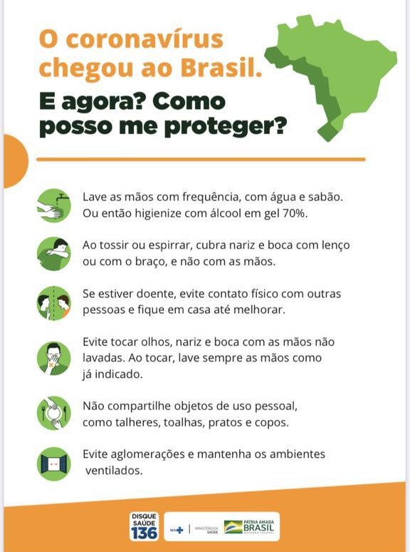 Alguns cuidados são de extrema importância, sendo orientações do Ministério da Saúde, como lavar as mãos com frequência, evitar contato com olhos, nariz e boca com as mãos não lavas, dentre outras que estão elencadas na imagem a seguir: