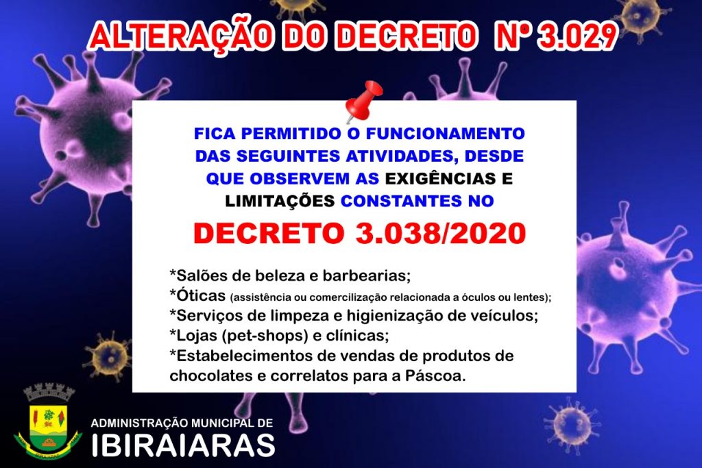 DECRETO MUNICIPAL EMITIDO NA MANHÃ DESTA QUARTA-FEIRA AUTORIZA O FUNCIONAMENTO DE ALGUMAS ATIVIDADES Publicado em 8 de abril de 20208 de abril de 2020 por Assessoria de Imprensa e Comunicação Prefeitura de Ibiraiaras Acesse na íntegra o teor do Decreto 3.038/2020 para verificar as exigências e as limitações de cada atividade.https://www.ibiraiaras.rs.gov.br/wp-content/uploads/2020/04/DECRETO-N%C2%BA-3038-2020-ALTERA-DECRETO-3029-2020.pdf