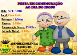 A Administração Municipal através da Secretaria de Habitação e Ação Social convida para a Festa em Comemoração ao Dia do Idoso, que será realizada no dia 24 e novembro no Clube União, com diversas atividades, as quais terão início ainda pela parte da manhã.
