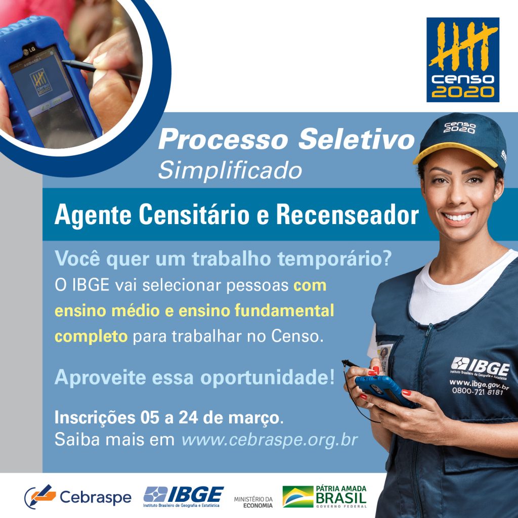 Estão abertas as inscrições até o dia 24 de março para interessados em participar do Processo Seletivo Simplificado do IBGE.