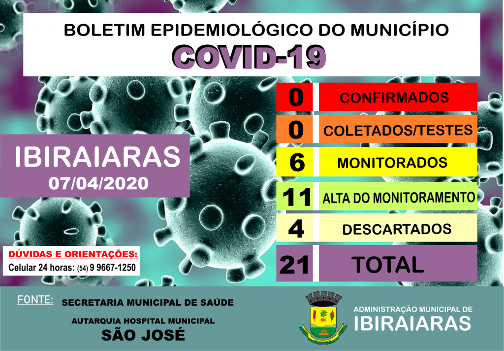 MAIS PESSOAS RECEBEM ALTA DO MONITORAMENTO Publicado em 7 de abril de 20207 de abril de 2020 por Assessoria de Imprensa e Comunicação Prefeitura de Ibiraiaras Confira o boletim epidemiológico desta terça-feira (07) onde mais pacientes receberam alta do monitoramento do Coronavírus.