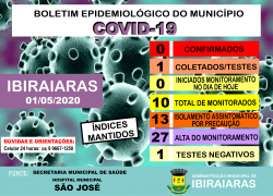 BOLETIM EPIDEMIOLÓGICO 01/05 Publicado em 1 de maio de 2020 por Assessoria de Imprensa e Comunicação Prefeitura de Ibiraiaras