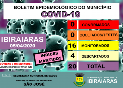 BOLETIM EPIDEMIOLÓGICO 05 04 Publicado em 5 de abril de 2020 por Assessoria de Imprensa e Comunicação Prefeitura de Ibiraiaras