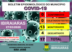 Boletim Epidemiológico 27 03 Publicado em 27 de março de 2020 por Assessoria de Imprensa e Comunicação Prefeitura de Ibiraiaras